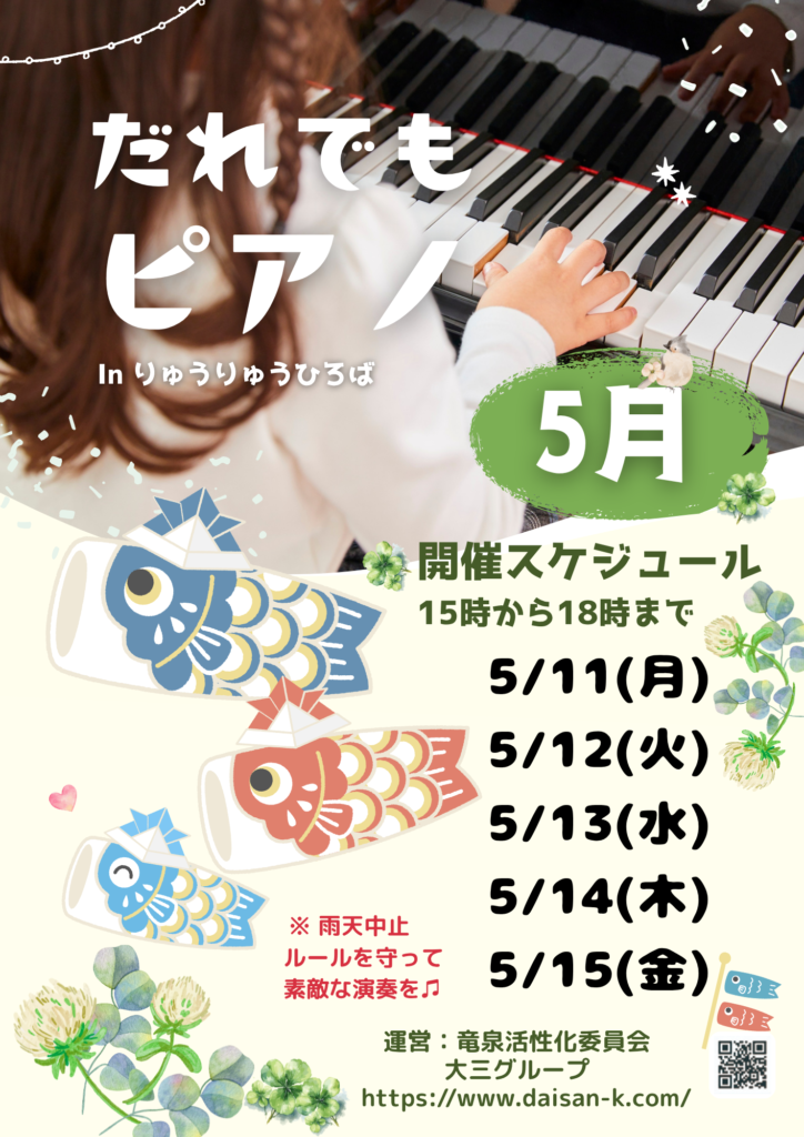 5月は「だれでもピアノ in りゅうりゅうひろば」を、下記の日程で開催いたします。